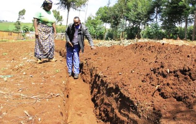 A farmer inspects a trench running across a farm on the sloppy Baraka ranges in Kuresoi North. [Kennedy Gachuhi/Standard]