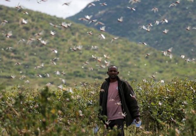 Ahmed Ibrahim, 30, an Ethiopian farmer attempts to fend off desert locusts as they fly in his khat farm on the outskirt of Jijiga in Somali region, Ethiopia January 12, 2020.