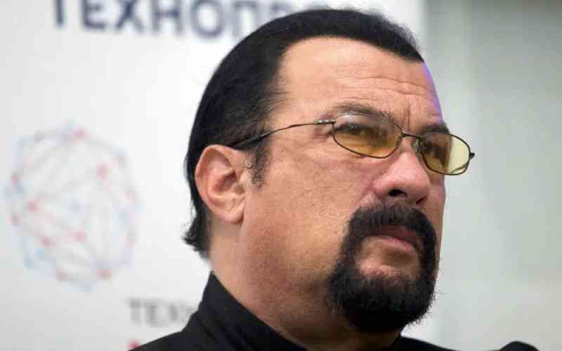 FILE - Steven Seagal speaks at a news conference while attending an opening ceremony for a research and development center in Moscow, Russia, Sept. 22, 2015. (AP Photo/Ivan Sekretarev, File)