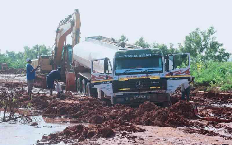 A fuel tanker stuck in mud after a section of the road was cut off by raging floodwaters in Mandera County. [Ibrahim Adan Ali, Standard]