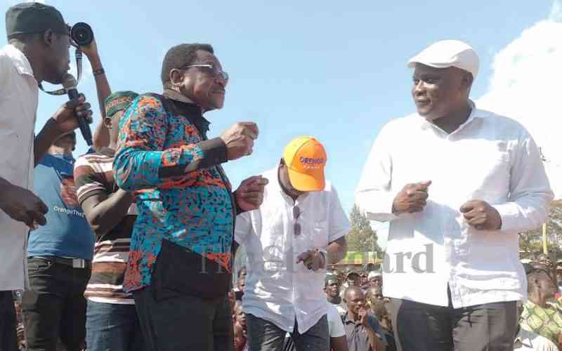 Senator James Orengo (center) asked the locals to turn out in large numbers and vote for Raila Odinga. [Isaiah Gwengi, Standard]