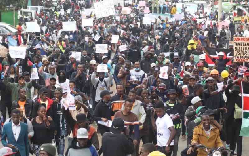 Demonstrators walk along Nyeri's Kenyatta Highway during the anti-Finance Bill demos in Nyeri, June 25, 2024. [Mose Sammy, Standard]