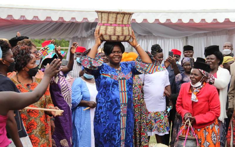 Homa Bay woman representative Gladys Wanga carries a basket given by women colleagues during her endorsement for governor seat at Karabondi in Karachuonyo constituency on December 30, 2021. [James Omoro, Standard]
