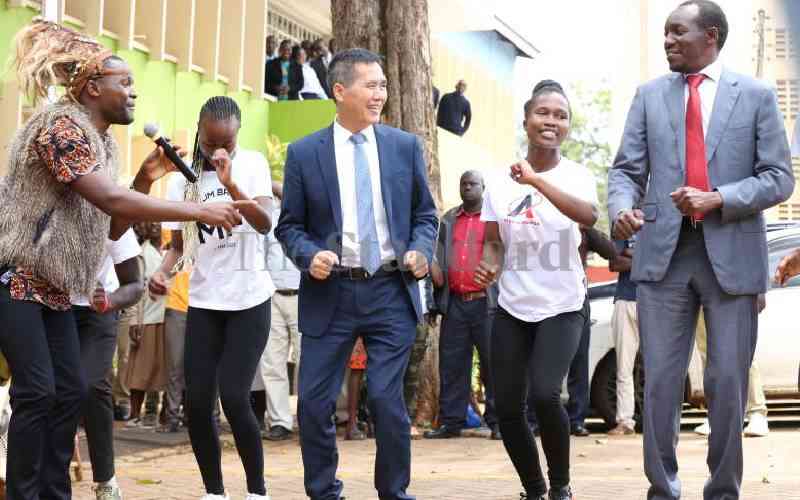 Chinese Ambassador to Kenya Zhou Pingjian and Kisii Governor Simba Arati joins local musicians in a dance at the County Headquarters. Mr. Pingjiani said sub-government bilateral engagements would help and leverage the devolved units grow at a faster pace. [Sammy Omingo, Standard]