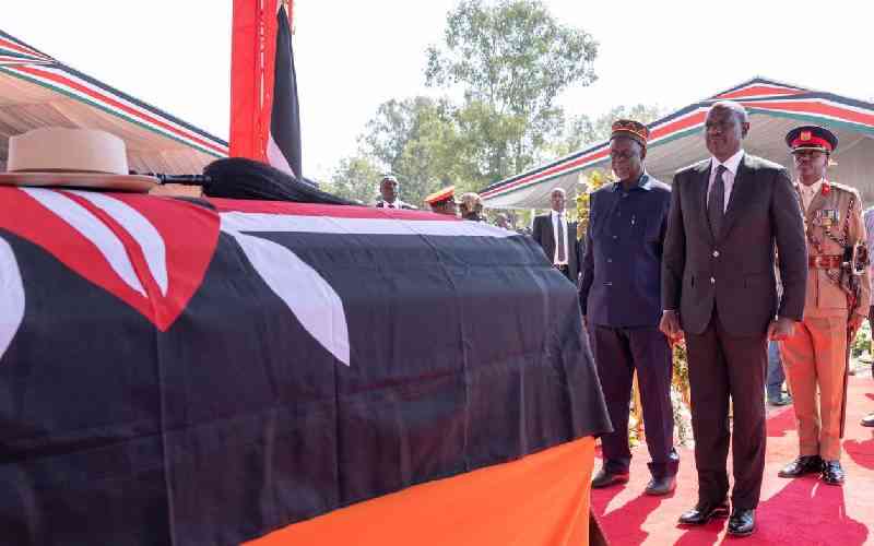 President William Ruto and Siaya Senator Oburu Oginga pay last respects to the late former Prime Minister Raila Odinga at Jaramogi Oginga Odinga University, on October 19, 2025. [Benjamin Sakwa, Standard]