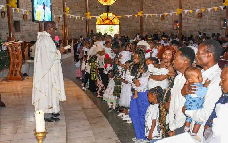 Father George Munyaka during Christmas Day celebrations at Christ the King Cathedral in Nakuru City on December 25, 2025. A total of 23 children were baptized. [Kipsang Joseph, Standard]