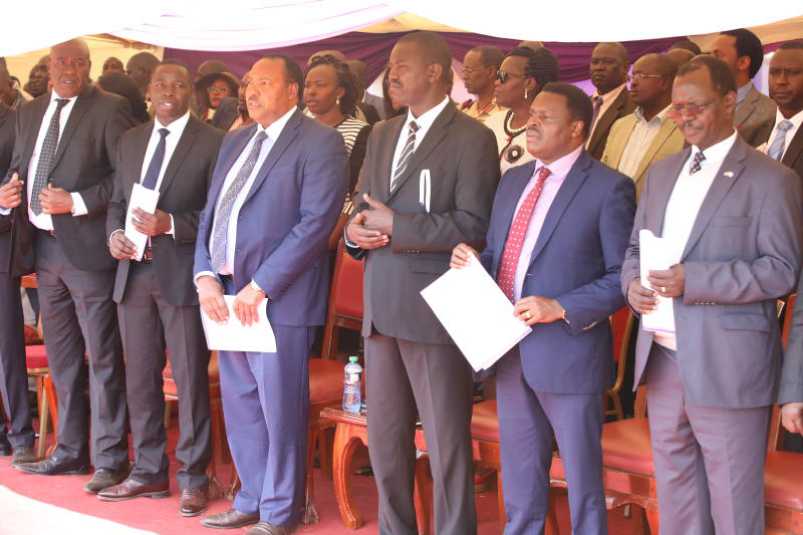 From Right- Governors John Lonyangapuo (West Pokot), Muthomi Njuki (Tharaka Nithi), Jackson Mandago (Uasin Gishu), Ferdinand Waititu (Kiambu) and Stephen Sang (Nandi) during the funeral of Governor Mandago's mother Salina Lelei at Limnyomoi in Uasin Gishu County. The leaders assured residents that the agreement between the president and his deputy on the 2022 succession politics still stands. 07-08-2018. [PHOTO BY: KEVIN TUNOI]