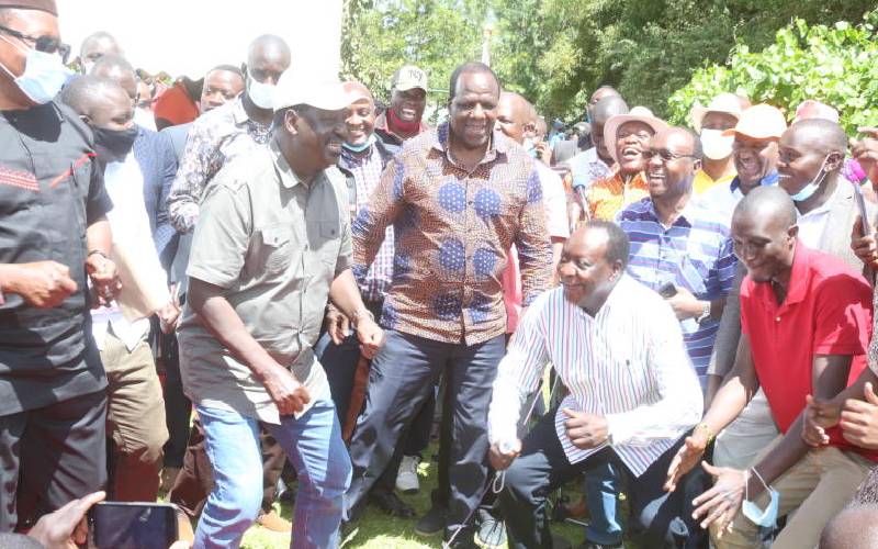 ODM leader Raila Odinga joins a section of politicians and youth from Western in a dance during a meeting with Vihiga County ODM youth leaders at Sosa cottages. [Benjamin Sakwa, Standard]