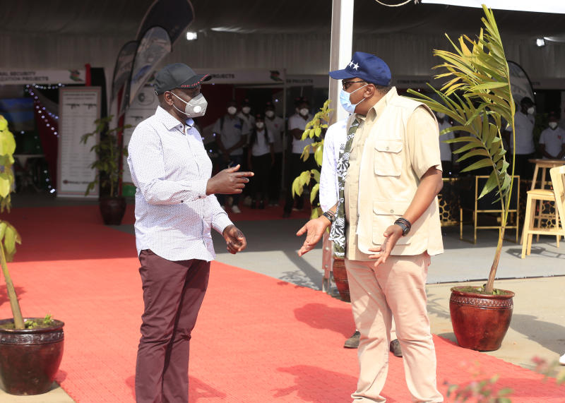 President Uhuru Kenyatta and his Deputy William Ruto chat after innovative youths demonstrated multi Agency projects to the Head of State during his visit at the KWS Law Enforcement Academy in Manyani on October 16, 2020. [Stafford Ondego, Standard]