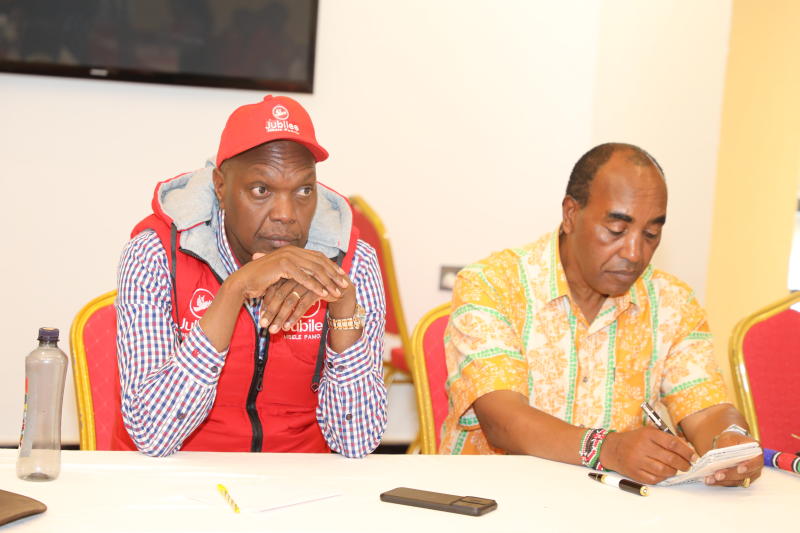 Jubilee Secretary-General Jeremiah Kioni and Governor Francis Kimemia during a meeting with aspirants in Ol Kalou yesterday. [James Munyeki, Standard]