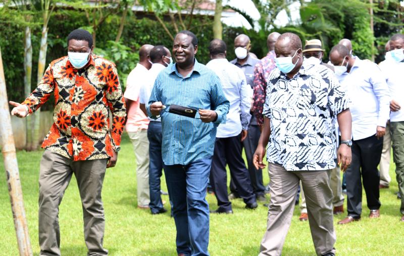 ODM leader Raila Odinga (center) with Defnce CS Eugene Wamalwa (left) and Interior CS Fred Matiang'i (right) in a past meeting. [Denish Ochieng, Standard]