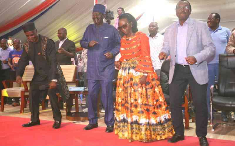 Pastor Peter Manyuru (left) with Azimio presidential candidate Raila Odinga, his running mate Martha Karua and Kalonzo Musyoka among other leaders during Sunday worship at Jesus Teaching Ministries in Donholm on August 21, 2022. [Denish Ochieng, Standard]