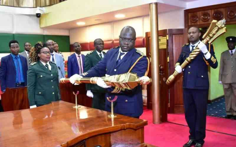 Nyandarua County assembly sergeant at arms lays a new mace after it was unveiled in 2019. [File, Standard]