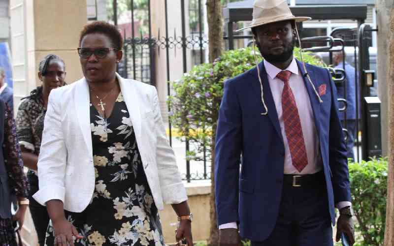 Embattled Meru Governor Kawira Mwangaza and her spouse Murega Baichu arrive at the Senate chambers on day two of her impeachment hearing. [Elvis Ogina, Standard]