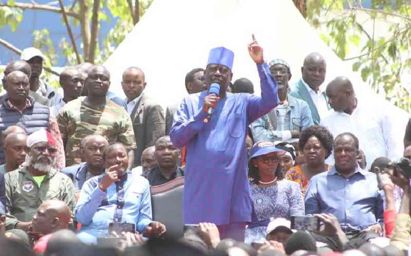 Azimio party leader Raila Odinga addressing a crowd at the Jevanjee Gardens in Nairobi during the Azimio prayer rally on February 22, 2023. [Denis Kibuchi, Standard]