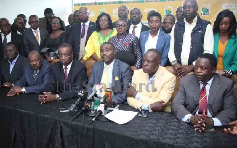 UDA Secretary-General Cleophas Malala (centre) with a section of Kenya Kwanza leaders and Raila Odinga's allies who defected to the party. [Wilberforce Okwiri, Standard]