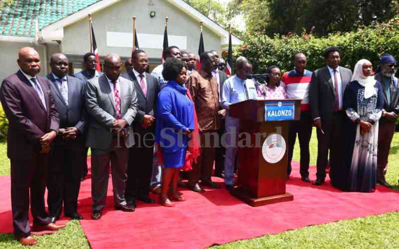 Azimio la Umoja leaders address the press at the SKM Command Center regarding bipartisan talks, April 18, 2023. [Silas Otieno, Standard]