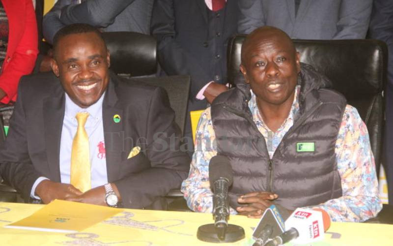 Deputy Rigathi Gachagua at UDA Headquarters in Nairobi flanked by UDA Secretary General Cleophas Malala on June 26, 2023. [Edward Kiplimo, Standard]