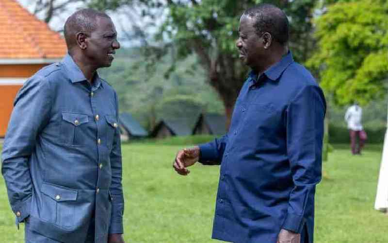 President William Ruto and ODM leader Raila Odinga at Yoweri Kaguta Museveni's Kisozi country home, February 2024. [PSCU]