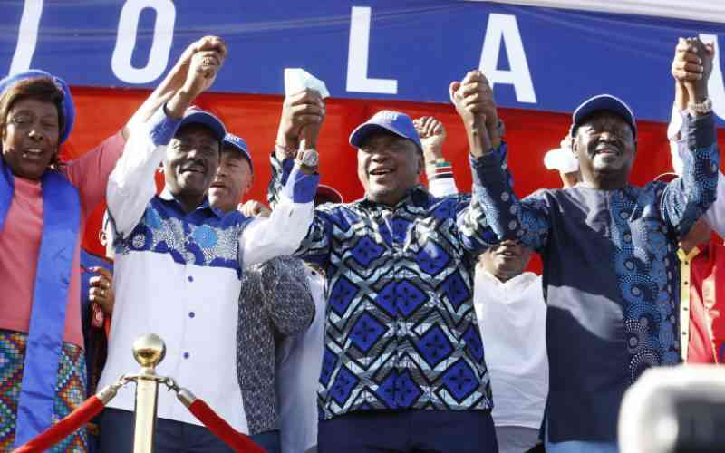Charity Ngilu, Kalonzo Musyoka, Uhuru Kenyatta and the late ODM leader Raila Odinga at the Azimio flag bearer unveiling in Nairobi on March 12, 2022. [File, Standard]