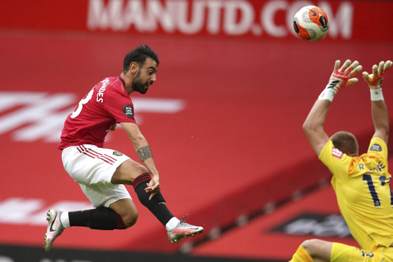 Manchester United's Bruno Fernandes, left, attacks against Bournemouth's goalkeeper Aaron Ramsdale during the English Premier League soccer match between Manchester United and Bournemouth at Old Trafford stadium in Manchester, England, Saturday, July 4, 2020. (AP Photo/Dave Thompson, Pool)