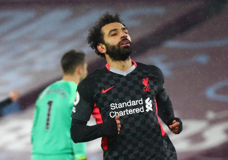 Football - Premier League - West Ham United v Liverpool - London Stadium, London, Britain - January 31, 2021. Liverpool's Mohamed Salah celebrates scoring their second goal. [Pool via REUTERS/Clive Rose]