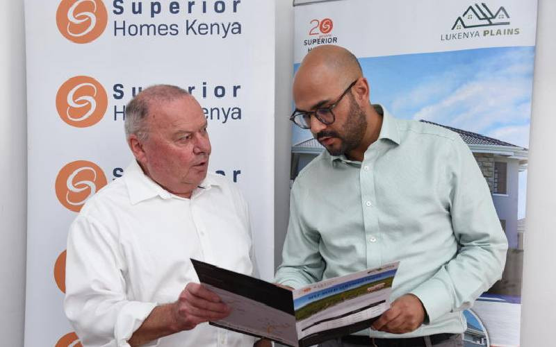 Superior Homes CEO Shiv Arora (right) and Managing Director Ian Henderson during the launch of Kanzi Springs. [David Njaaga, Standard]