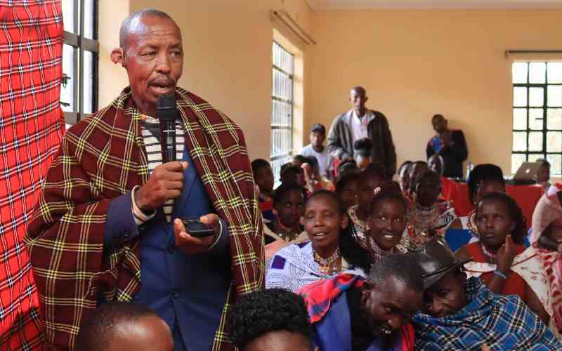 David Ole Simel contributes to the period poverty discussions during the Ms President community dialogues in Kisamis Kajiado. [Courtesy]