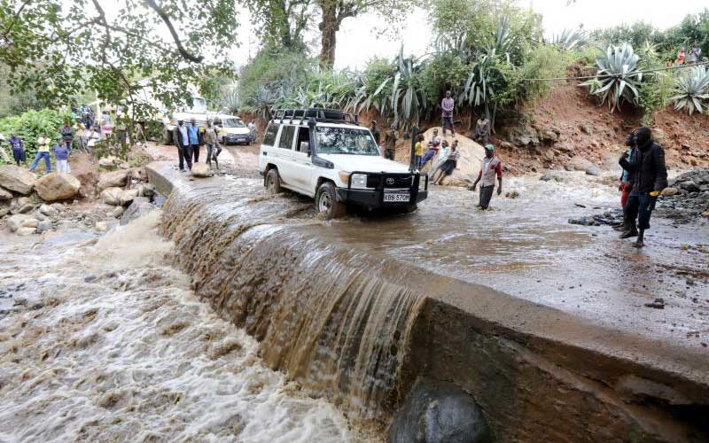 A vehicle drives through a damaged bridge at Ortum in West Pokot. Weiwei and Sebit bridges were washed away by floods, cutting off transport between Kitale and Lodwar. Disaster coordination is still a challenge for Government agencies. [Kevin Tunoi, Standard]