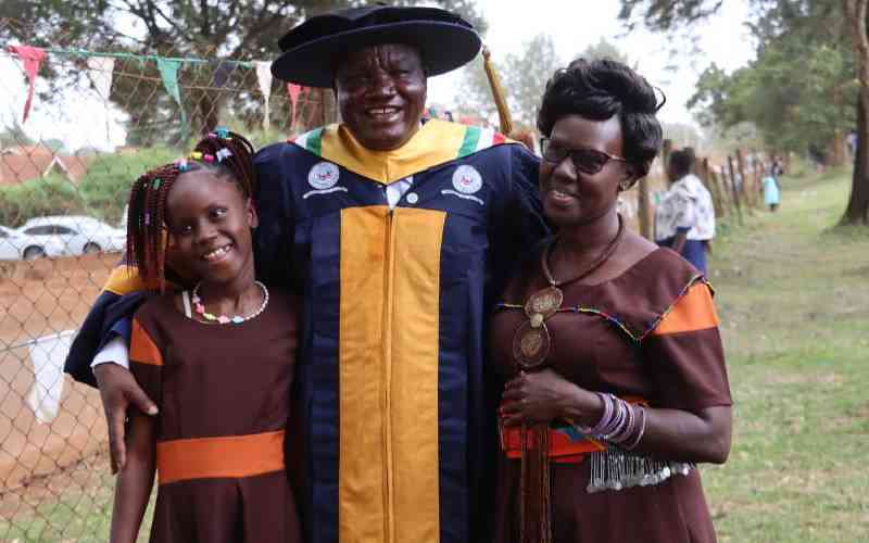 Dr Daniel Ing'ollan Nawose, his wife Rebecca Amimlim and daughter Avy Nabos after he graduated with a PhD at Moi University in Eldoret, on December 20, 2024. [Peter Ochieng, Standard]
