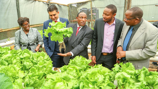 Miramar International College founder, Dominic Mwenja (c), offers consultation on the process involved in production of Lettuce through hydroponics technique.