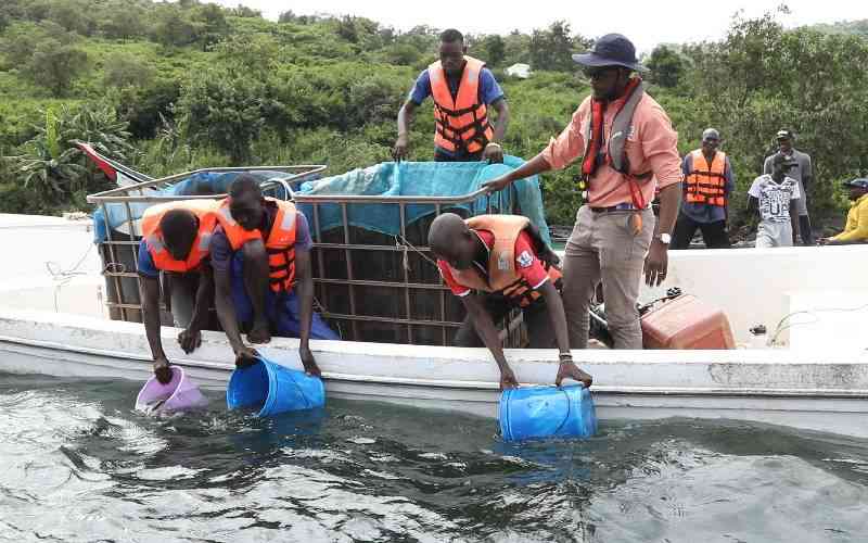 Victory Farms workers during restocking of endangered species of tilapia in Lake Victoria. [James Omoro, Standard].