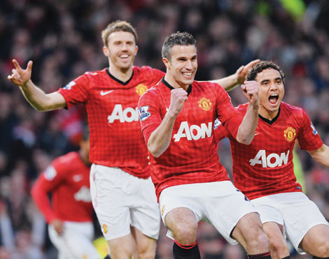 Manchester United’s Dutch striker Robin van Persie (centre) celebrates scoring a goal against Aston Villa during past English Premier League football match. Manchester United will host Swansea today in FA Cup. [PHOTO: AFP]