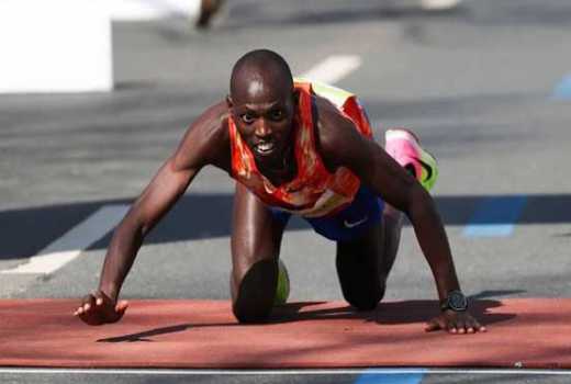 Kunyuga was heading towards victory when he began to wobble and stagger. Soon, he collapsed, but miraculously continued to the finish line on his hands and knees.