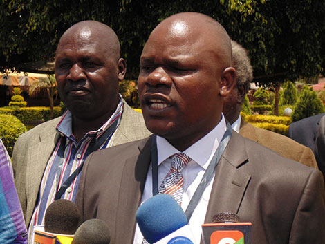| Football Kenya Federation President Vice President Robert Asembo addresses the press after attending a special general meeting at a hotel in Eldoret. Asembo who was in the position in an acting capacity was endorsed into the position. 26-09-2014. PHOTOS BY: KEVIN TUNOI |