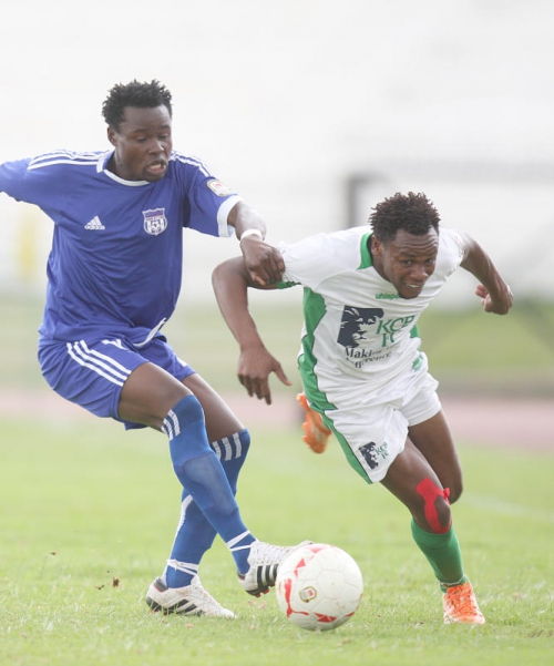 City Stars's Clavin Masawa (left) Challenges KCB's Benjamin Chaka during their KPL clash at Nyayo Stadium on April 18, 2015.PHOTO/DENNIS OKEYOCaption