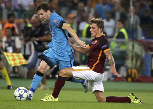 AS Roma's Lucas Digne (R) challenges Barcelona's Lionel Messi during their Champions League Group E stage match at the Olympic stadium in Rome, Italy , September 16, 2015. REUTERS/Max Rossi