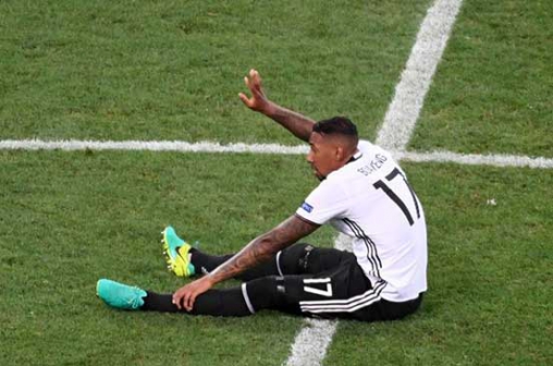 Germany's defender Jerome Boateng reacts during the Euro 2016 semi-final football match between Germany and France at the Stade Velodrome in Marseille on July 7, 2016. / AFP PHOTO / PASCAL GUYOT