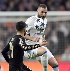 Real Madrid's French forward Karim Benzema (R) vies with Napoli's midfielder Lorenzo Insigne during the UEFA Champions League round of 16 first leg football match Real Madrid CF vs SSC Napoli at the Santiago Bernabeu stadium in Madrid on February 15, 2017. / AFP PHOTO / JAVIER SORIANO