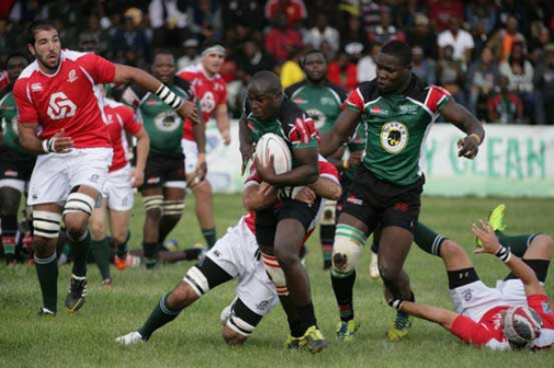 Portugal National Rugby Team Winger Diogo Toorn, left, tries to stop outside Ten Isaack Adimo, with the ball, assisted by Kenya's Winger Jacob Ojee, right during a friendly game at Harliquins grounds on Saturday, May 30th, 2015. PHOTO/ JONAH ONYANGO.