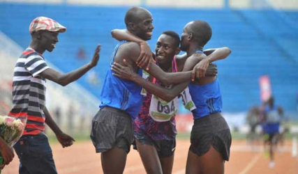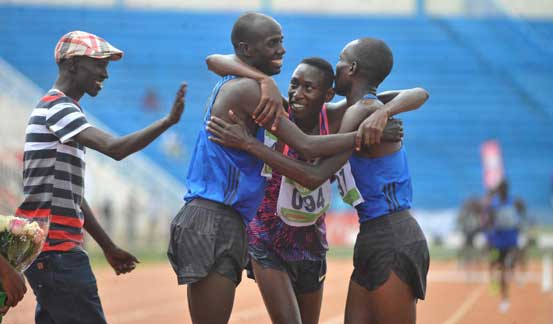 Ezekiel Kemboi congratulates Brimin Kipruto, Conselous Kipruto and Jairus Birech after they finished 3000m steeplechase during the national athletics trials at Nyayo staium.PHOTO/DENNIS OKEYO