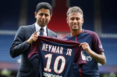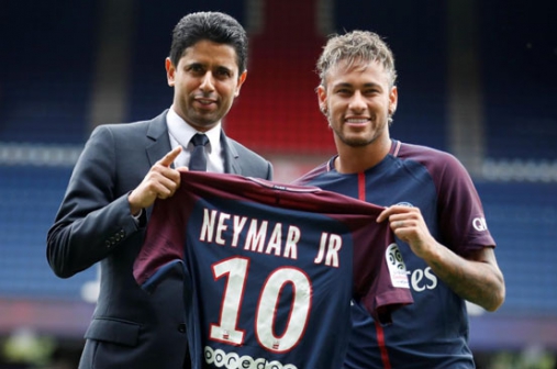 Paris Saint-Germain F.C. - Neymar Jr Press Conference - Paris, France - August 4, 2017 New Paris Saint-Germain signing Neymar Jr and Chairman and CEO Nasser Al-Khelaifi pose with the club shirt