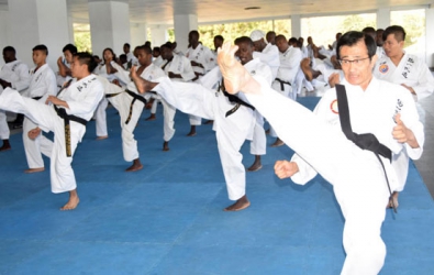 Participants for the 5th edition of the Mombasa Open Tong-Il Moo-do International Martial Arts championship do their katas during the opening of the championship at the Aga khan Academy, September 23, 2017. [PHOTO BY GIDEON MAUNDU/STANDARD].