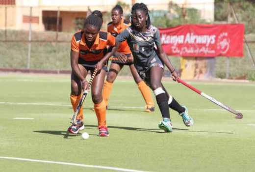 Orange Telkom Ruth Njoki(l) protects the ball as Strathmore Jane Apondi give chase when they played women National League at City Park, Nairobi. ON 15/04/2017