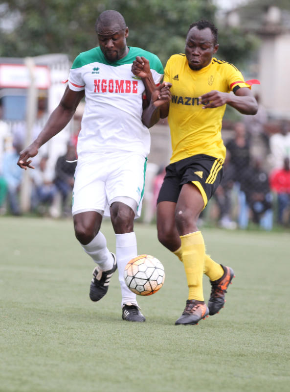 KPL MATCHES Mathare United FC's George Owino (left) and Kennedy Ayako of Wazito FC during KPL match at Camp Toyoyo on Saturday April 21, 2018. [Jonah Onyango, Standard]