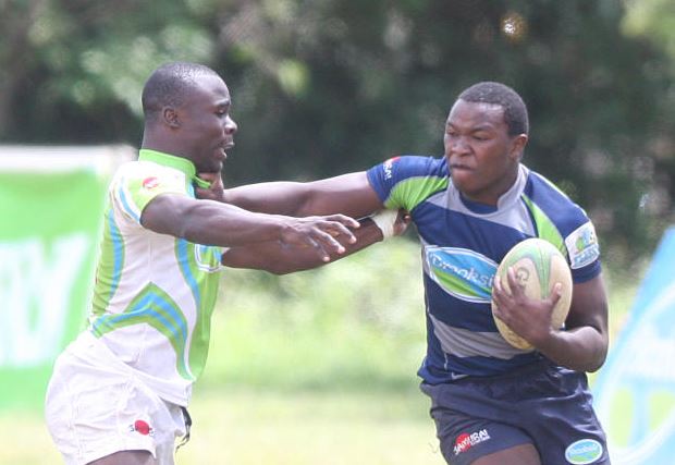 Jason Odongo (right) of Upper Hill High School (Kenya) holds off Isaac Kubasu of St. Peters Mumias (Kenya) during their East Africa Secondary School Games rugby match at Eldoret Sports Club [Dennis Okeyo, Standard]