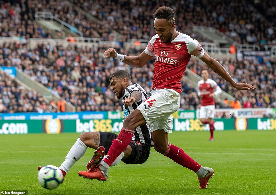 Arsenal forward Pierre-Emerick Aubameyang loses possession after a strong tackle from Newcastle's DeAndre Yedlin