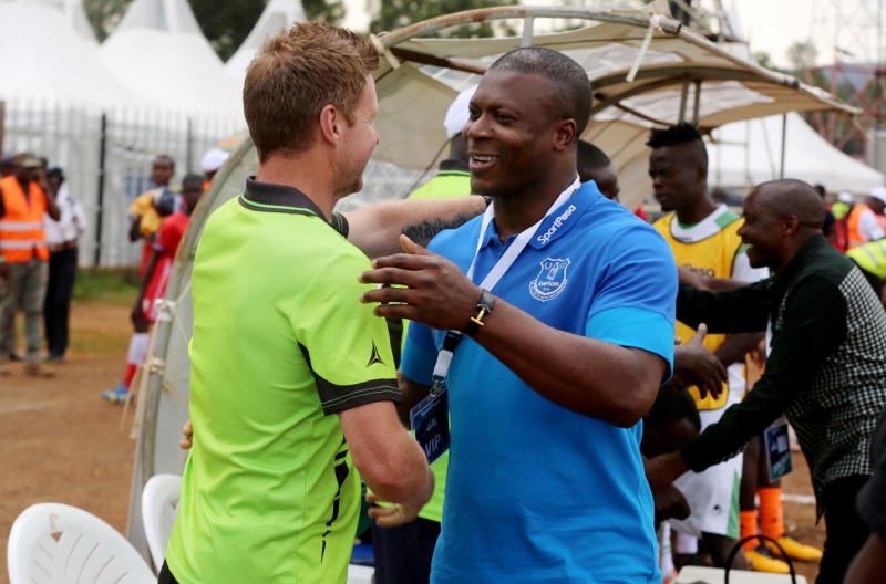 Everton Lagend Yakubu Aiyegbeni Gor Mahia coach Dylan Kerr (left) with Everton Legend Yakubu Aiyegbeni during the sportpesa Supercup between Gor Mahia and Singida at Afraha Stadium in Nakuru on June 7,2018.Photo:Kipsang Joseph/Standard