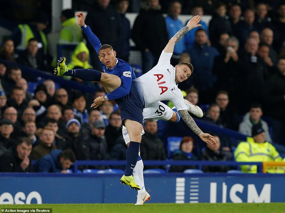 Tottenham defender Kieran Trippier and Richarlison collide in the air as they look to win an aerial duel in the early stages