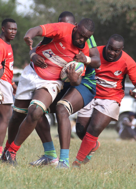 Impala's Davies Makori (left) is tackled by Davis Chenge of KCB during Kenya Cup match at KCB grounds on Saturday Feb 16, 2019. [Jonah Onyango, Standard]